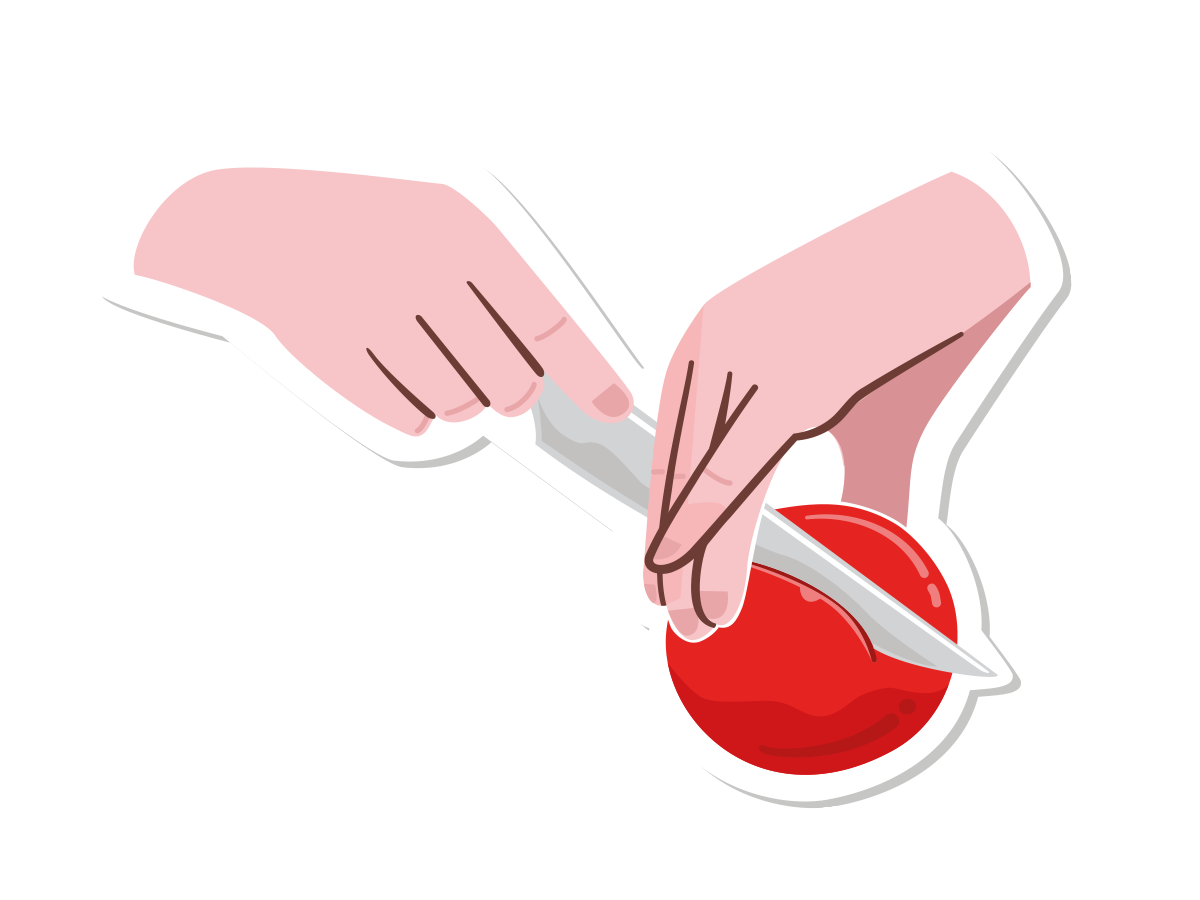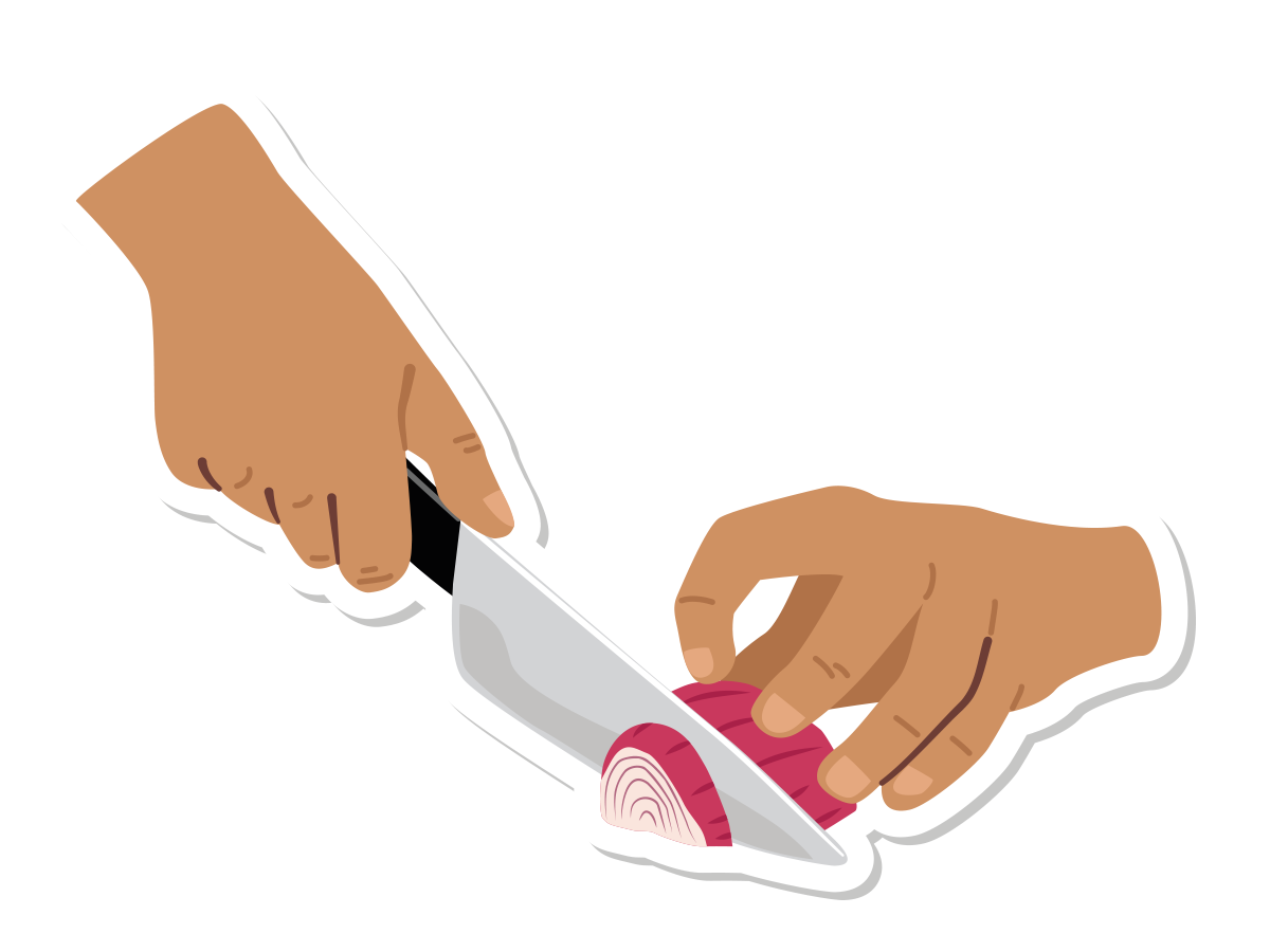 Start with the “bridge”, perfect for rounder veg like cucumber or peppers. Stretch your thumb away from your fingers in a bridge shape and use that hand to hold the end of the veg steady while you chop carefully and slowly with your other hand, making sure to tuck your thumb in on your bridge hand and move it along as the knife gets closer.
