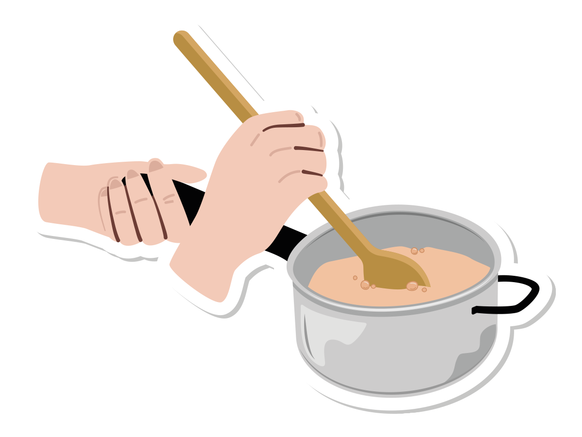 Have an adult help you when stirring over heat though – you will need to keep fingers off the hot pan, use oven gloves when necessary, hold handles carefully and use wooden rather than metal spoons or spatulas to avoid the heat reaching your fingers.
