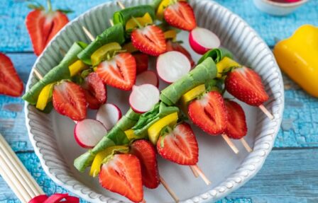 Hedi’s Summer Veg & Strawberry Salad Sticks with Tahini Dressing