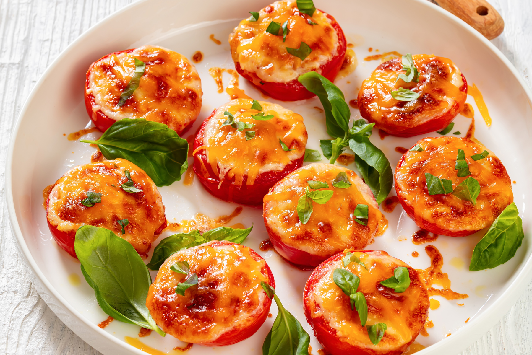 For extra fun for kids, try adding a slice of pepperoni on top of the tomato slices before topping with the cheese and breadcrumbs and call them pizza bites.