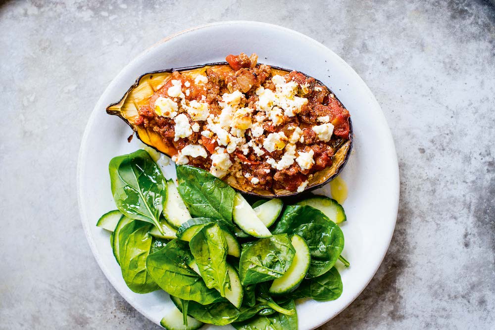 5. Remove the aubergines from the oven and spoon the mince mixture on top. Crumble the feta over the mince and return to the oven for 10 minutes, or until the feta is softened and lightly browned.