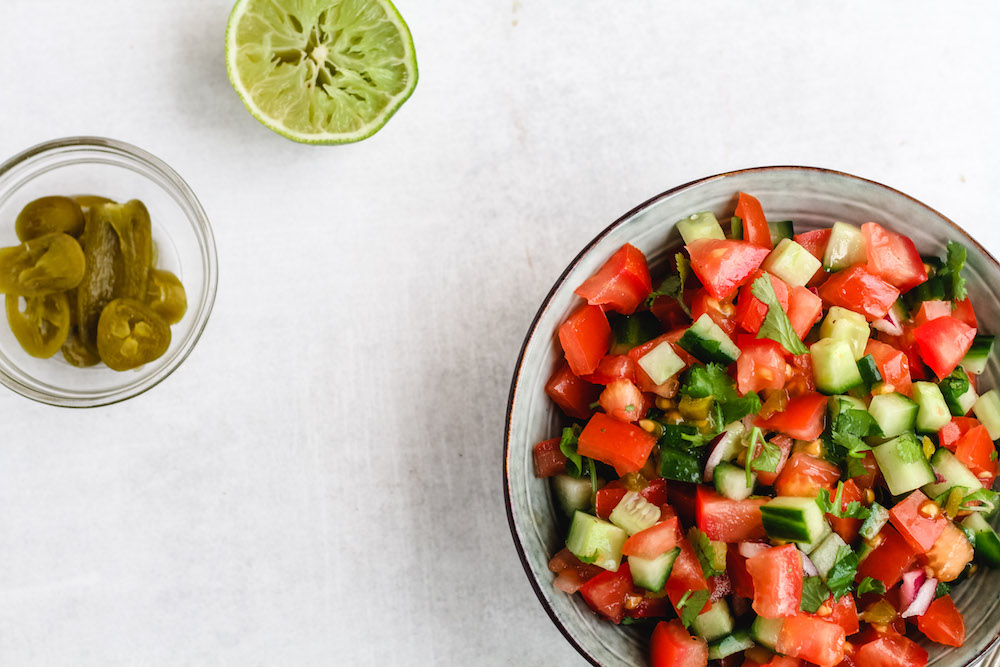 Dice the tomatoes, onion(s) and cucumber as small as you can. Roughly chop the jalapeno slices. Mix everything together. Add more jalapenos, salt & pepper, lime or lemon juice and/or coriander to taste.