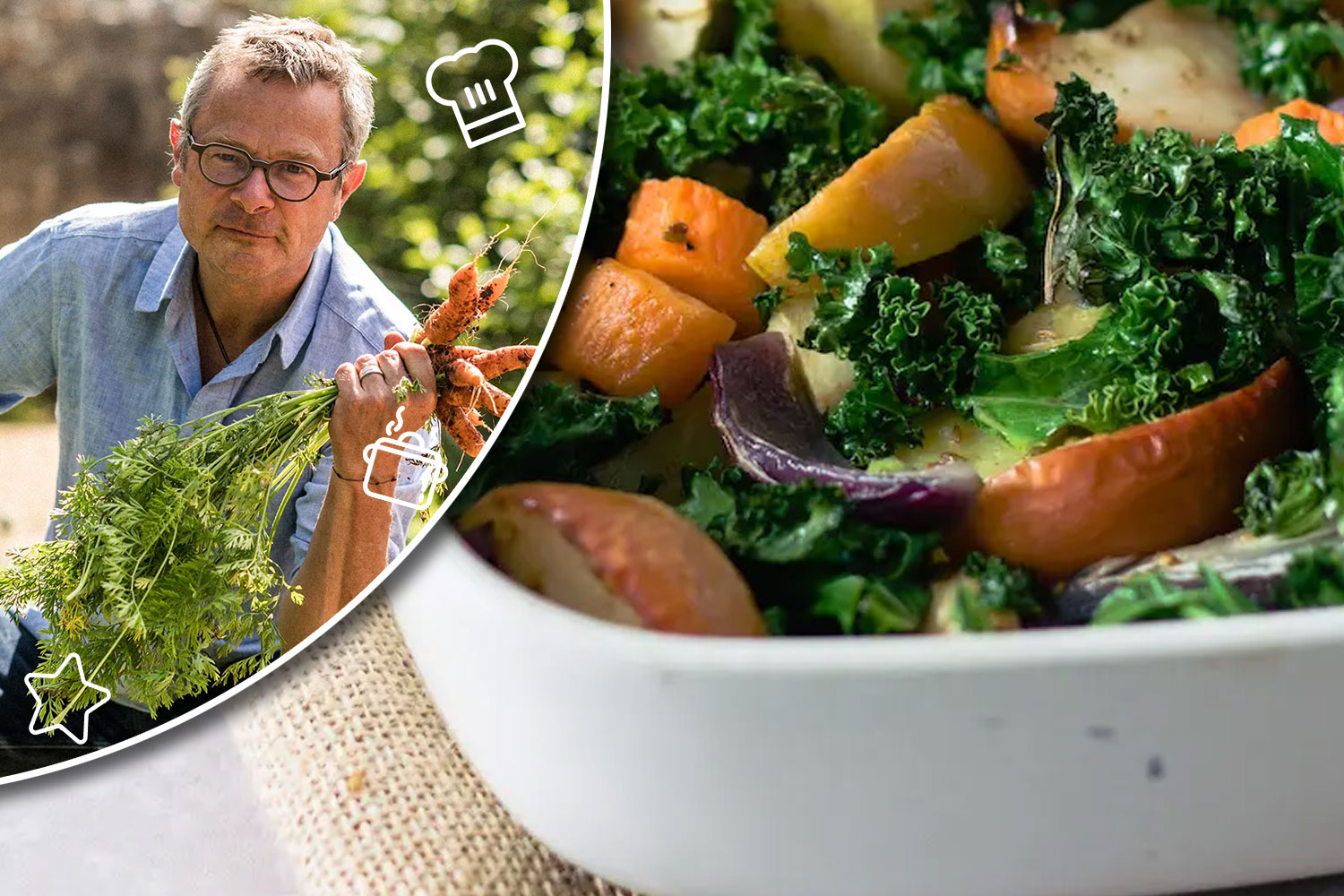 I cooked this incredibly simple dish for comedian and self-confessed veg-dodger Ross Noble, in answer to his challenge: “can you make vegetables edible?” I’m pleased to say, it won him over! The recipe can easily be customized to whichever roots and greens you have to hand.