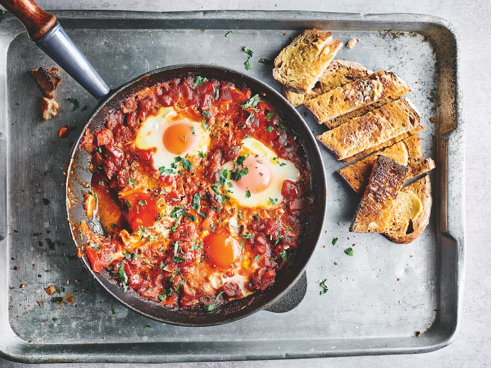 Finish with a scattering of chopped coriander leaves. Serve with toast fingers for dipping, or flatbread. Eat your shakshuka straight out of the pan.