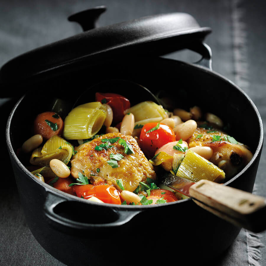 2. Heat the oil in a frying pan and fry the chicken until browned, transfer to a casserole dish. Mix in the frankfurters, beans, leeks, garlic and stock. Cover and bake for 35 minutes.