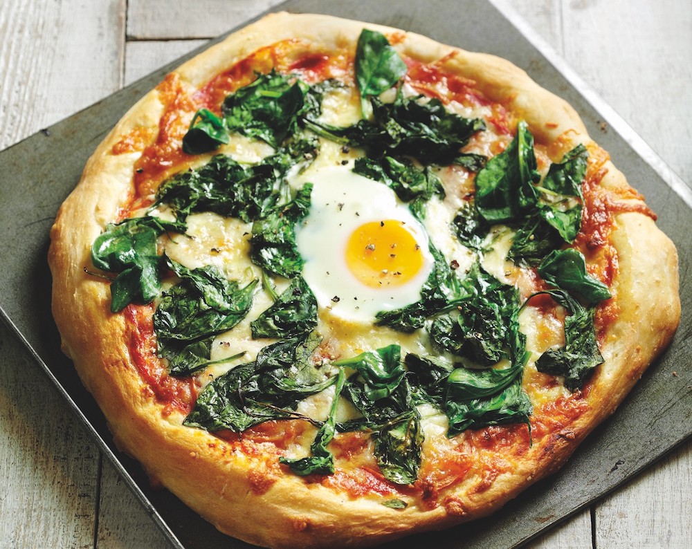 Wilted spinach and egg make for a delicious pizza topping – simply add with any of your other favourite ingredients and enjoy.
