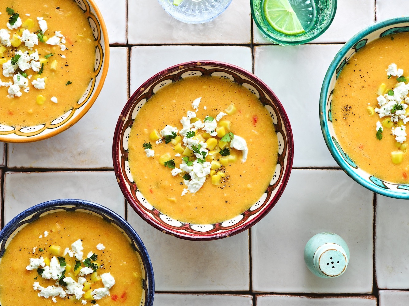 Inspired by the traditional Mexican street food, elate, this Mexican Street Corn Soup has all of the flavours of the grilled corn dish in a creamy and spicy soup. Topped with crumbled reduced-fat feta cheese, this recipe is low on calories but packs a flavour punch!