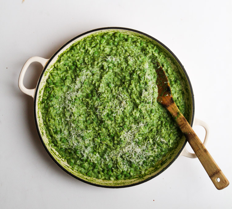 Blend or mash half the peas with the spinach and 200ml of stock.