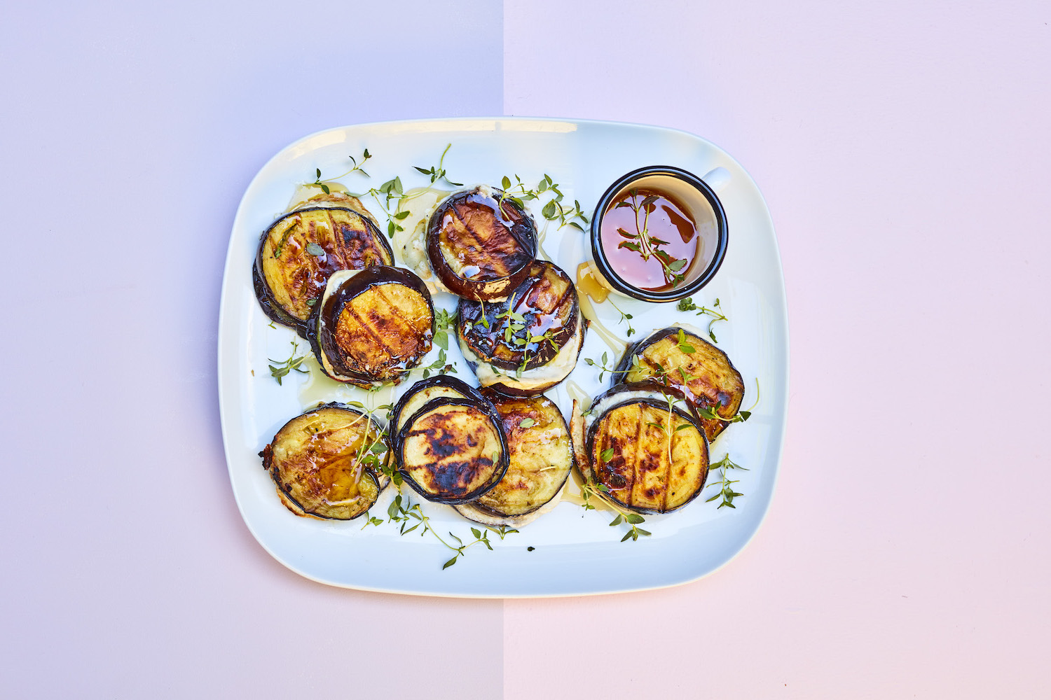 Cut the aubergines into 1cm slices, and the goat’s cheese into very thin rounds. Sandwich each piece of goat’s cheese between two similarly-sized slices of aubergine, along with a sprig of thyme. Brush both sides of the aubergine with oil and add a tiny pinch of sea salt flakes and black pepper.