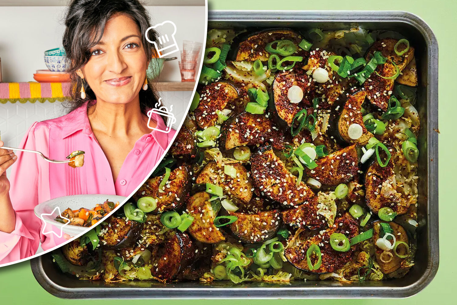 In the traditional Korean dish, aubergines are steamed for just 7 minutes before you gently stir in the red pepper and sesame dressing. In this version, I let the oven steam the aubergines, while fresh basmati rice and cabbage cook underneath for a simple and filling all-in-one dish. Gochugaru, or Korean red pepper flakes, are easily available online, at specialist shops, and even miraculously on Amazon – they really make the dish, and once you have a jar, you’ll find yourself scattering the flakes on everything (scrambled eggs are my favourite).