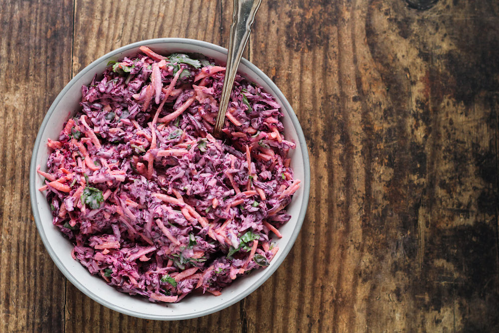 This simple coleslaw has just a few ingredients and is an easy way to get more veg into your kids. Healthier and cheaper than shop-bought coleslaw, it takes just a few minutes to make. A great way to perk up older veg!