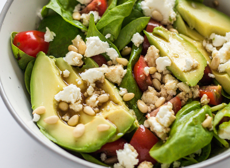 This is a simple salad that I often enjoy. I start with lettuce which is usually baby spinach or romaine. Then I slice little cherry tomatoes and slice the avocado pear and add them to the lettuce. I then crumble some feta cheese and sprinkle over and top this creation off with pine nuts.